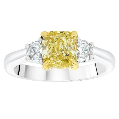 Yellow Flanked by Pair of Half Moons .92 ctw. Platinum and 18k Yellow Gold. • NATURAL YELLOWS AVAILABLE LOOSE AND MOUNTED. D. 2 1/2 ct Cushion Cut Diamond. Fancy Light Yellow Flanked by 2 Cushions 2.49 ctw and 14 Rounds .68 ctw. ... Access Content